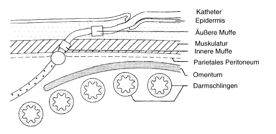 Um diesen Filter zu nutzen, wird mit einer kleinen Operation ein Kunststoffkatheter in die Bauchhöhle eingesetzt. Dieser 8 Millimeter dicke Kunststoffschlauch heilt in die Bauchwand ein und verbleibt so lange im Körper, wie das Peritonealdialyse-Verfahren vorgenommen wird.